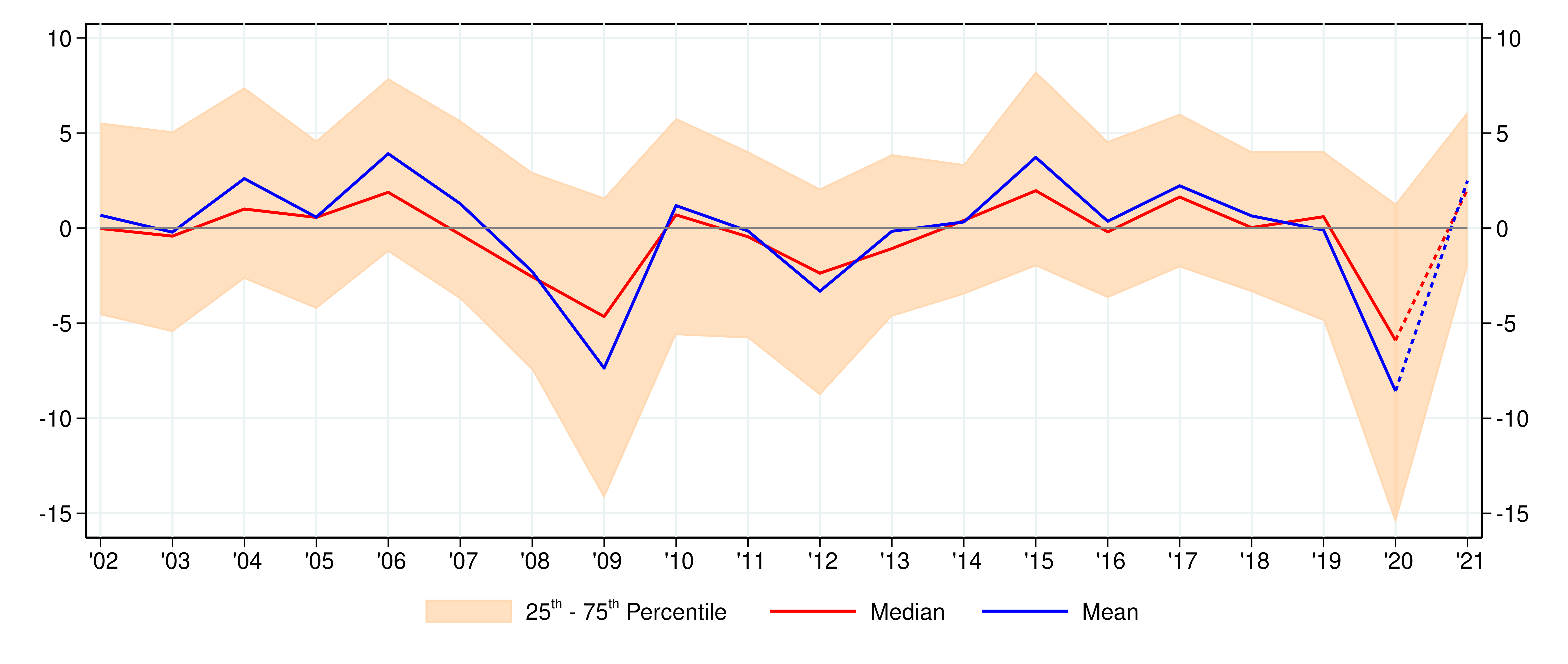 Note: (1) Does not include the construction sector. Data weighted by population weights and turnover. Values at constant prices calculated based on the average deflators obtained from the survey. The dotted lines indicate firms’ expectations for 2021.