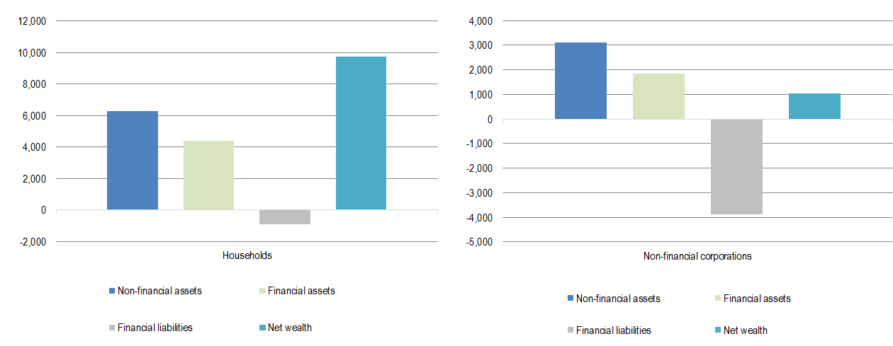 The net wealth of non-financial corporations amounted to €1,053 billion. Total assets equalled €4,943 billion, 63 per cent of which were non-financial assets. The financial component grew between 2013 and 2017, to stand at €1,840 billion. In contrast, there was a decline in the value of real assets, which largely consisted of non-residential real estate and machinery and equipment. Recourse to financing through securities and loans equalled €1,233 billion, a limited amount by international comparison.
